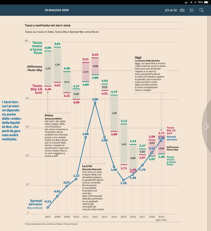 Questo grafico de il Sole 24 ore fotografa l’evoluzione della situazione tra mutui a tasso fisso a 10 anni e rendimenti dei BTP a 10 anni.
