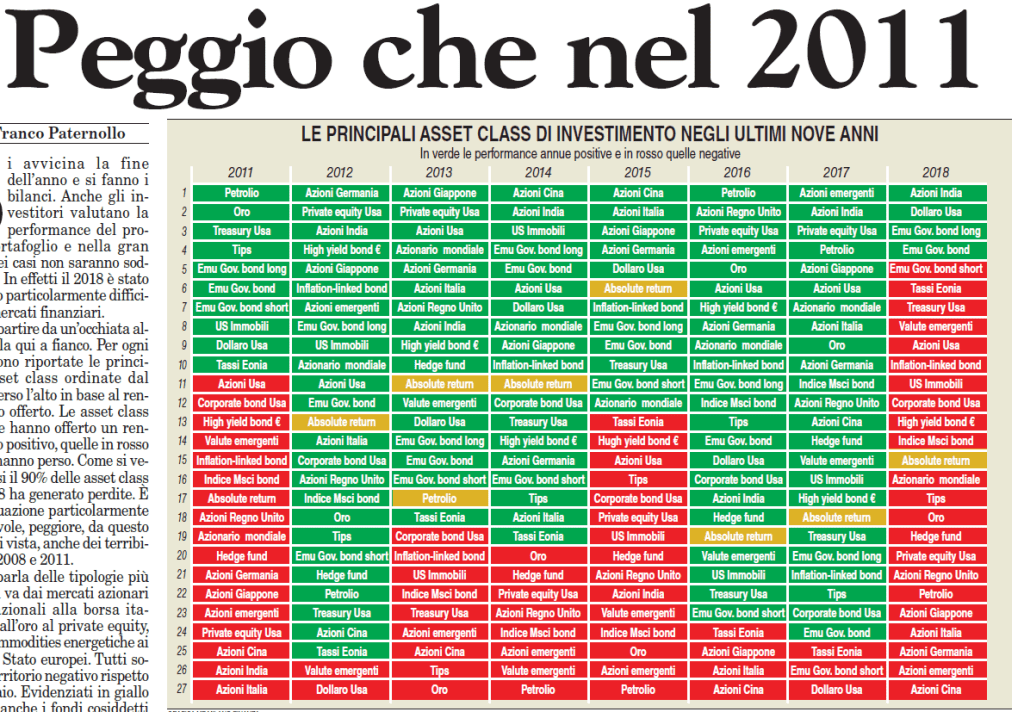 In questo genere di report si mostrava col colore rosso come stessero perdendo tutti i tipi di investimento, a fine anno tutta la colonna del 2018 diventò rossa.
