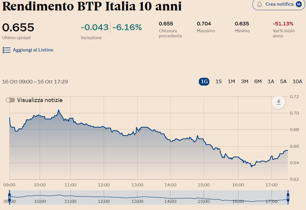 Qui si sta pagando! E su scadenze più lunghe i guadagni sono minimi: 0,655% (fonte il Sole 24 ore) sui BTP a dieci anni.