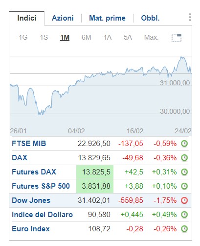 Questo è l’andamento del Dow Jones, uno dei principali indici azionari Usa ad un mese, quella gobbetta che vedete in alto a destra è il calo dell’ultima settimana. (n.d.r. Dati a questa mattina 26/02/2021 fonte investing.com)